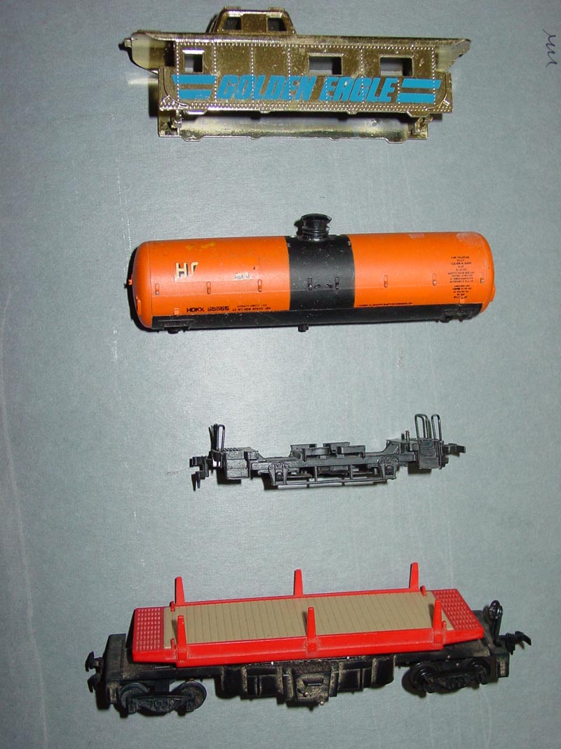Picture below. The chip on the caboose is right below the letter E in GOLDEN. The log car is complete and works well; the brake stand and wheel are a replacement. Dusty.