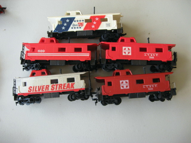 THIS LOT CONTAINS 5 TYCO CABOOSES - ALL ARE COMPLETE WITH THEIR RAILINGS AND LADDERS AND EVEN STOVE PIPES ON ROOF. THE SPIRIT OF 76 IS MISSING REAR TRUCKS - ALL OTHERS ARE COMPLETE. CABOOSES ARE SPIRIT OF 76 - MANTUA/TYCO SF PLASTIC BASE WITH METAL LADDERS/RAILINGS - TYCO SF WITH PLASTIC RAILINGS AND LADDERS - GENERIC #689 CABOOSE AND SILVER STREAK CABOOSE