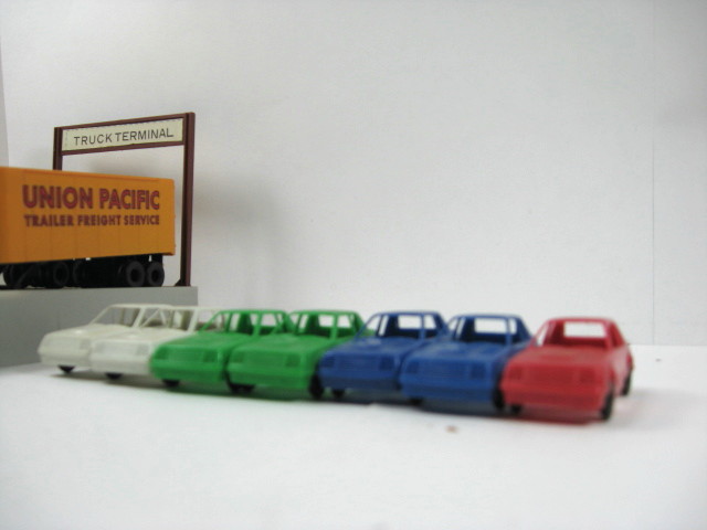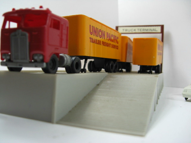 HERE IS A NICE LOT OF TYCO DODGE VEHICLES AND TYCO KW RED CABOVER WITH 3 U.P. TRAILERS AND RAMP PLATFORM