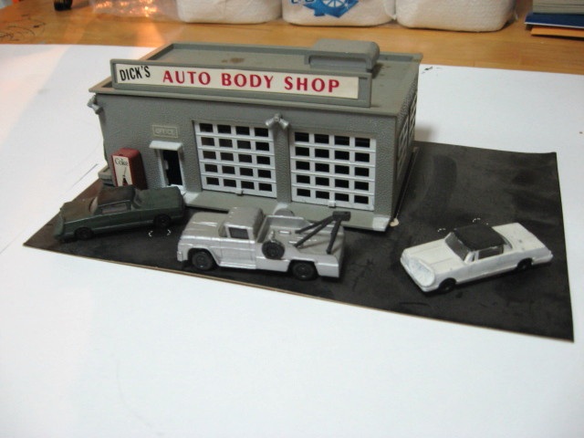 THIS IS DEFINITELY AN OLDER BACHMANN STRUCTURE - I HAVEN'T SEEN ONE OF THESE IN A VERY LONG TIME - COMES WITH TOW TRUCK AND CARS WHICH ARE FACTORY DAMAGED TO SIMULATE COLLISIONS FOR REPAIR. A NEAT SCENE ON YOUR LAYOUT - THIS BLDG IS IN GREAT SHAPE - ALSO COMES WITH BLACK CARDSTOCK ASPHALT PARKING LOT IN WHICH BLDG SITS ON AND IS IS GREAT SHAPE FOR AGE