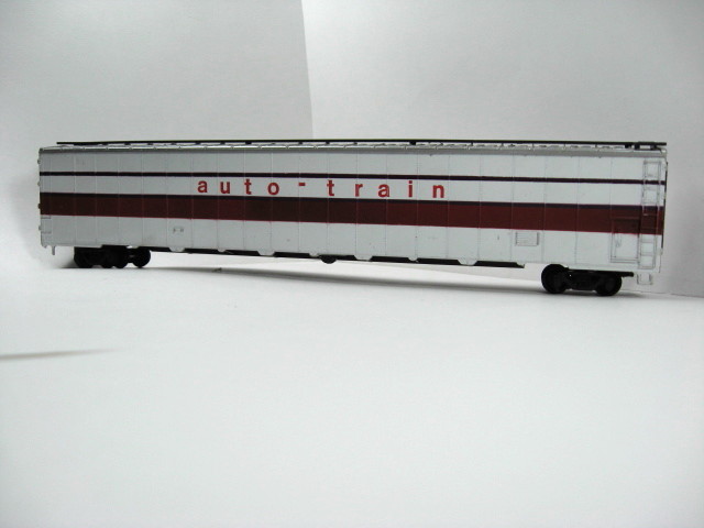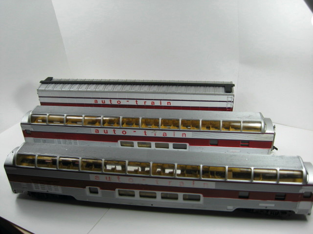 THIS LOT CONTAINS THE AUTO TRAIN PASSENGER CARS (2) AND 1 85' FOOT AUTO TRAIN BOXCAR. THE AUOT TRAIN NAME DECALS ARE FADED SOME ON THE PASSENGER CARS BUT THE CARS THEMSELVES ARE IN GREAT CONDITION - COULD BE CUSTOMIZED FOR YOU PROJECT RAILROADERS - THE PASSENGER CARS ARE COMPLETE AND HAVE ALL COUPLERS. VISIBLE INTERIOR SEATING WITH CLEAR WINDOWS. CARS ARE DOUBLE DECKERS NON LIGHTED. THE BOX CAR IS MISSING A STEP ON EACH SIDE AND BOTH COUPLERS ARE MISSING FROM TRUCKS - CAR IS SHINEY. THE BOXCAR IS SILVER ON ROOF AND THE SIDES ARE WHITE WITH DARK BLUE STRIPE WITH A LIGHTER BLUE STRIPE THEN DEEP RED STRIPE WITH AUTO TRAIN ON EACH SIDE. ENDS OF CAR IS DARK BLUE. THE PASSENGER CAR COLORS ARE = SILVER ROOFS AND ENDS - WHITE SIDES WITH BLUE STRIPES AND RED STRIPE.