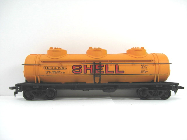 AHM SHELL TANK CAR WITH METAL WIRE RAILINGS - BOTH LADDERS ON CAR - HAS BRAKEWHEEL STAND BUT NO BRAKEWHEEL. ALL STEPS WHEELS AND HORN HOOK COUPLERS ON CAR