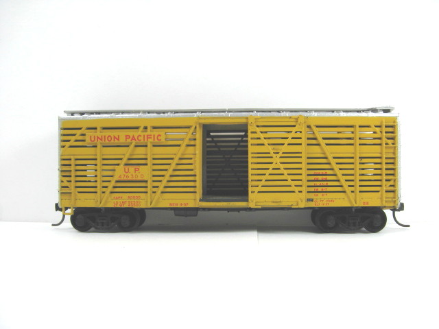 UNION PACIFIC CATTLE/LIVESTOCK CAR - MISSING ONE STEP ON EACH SIDE - HAS BRAKE WHEEL - KADEE #5 COUPLERS AND ALL WHEELS AND SLIDING DOORS