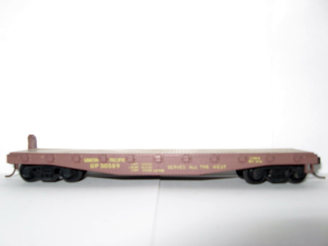 40 FT UNION PACIFIC FLAT CAR - CAR IS EQUIPPED WITH KADEE #5 COUPLERS - HAS ALL BUT ONE STEP - NO BRKAE WHEEL BUT HAS BRAKE WHEEL MAST. COMPLETE WITH ALL WHEELS