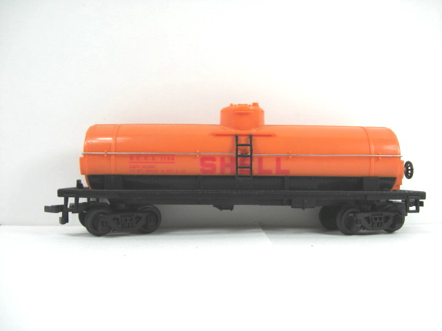 40 FT SHELL TANK CAR BY BACHMANN - CAR HAS METAL WIRE CENTER RAILINGS AND BOTH LADDERS ON EACH SIDE WHICH ARE PLASTIC. HAS BRAKE WHEEL ON END OF CAR ALSO