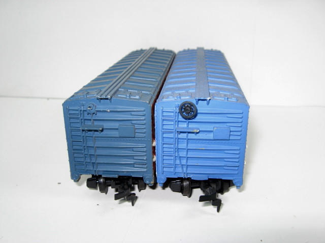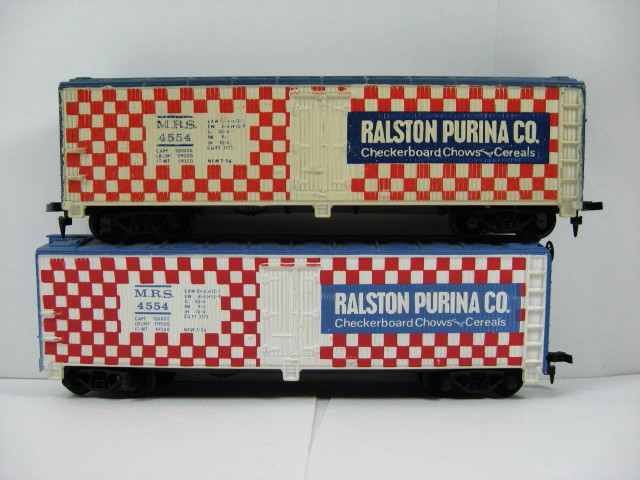2 RALSTON PURINA CARS - DIFFERENT COLOR ROOFS - ONE CAR HAS BRAKE WHEEL -THE OTHER DOESN'T - CARS ARE COMPLETE OTHERWISE