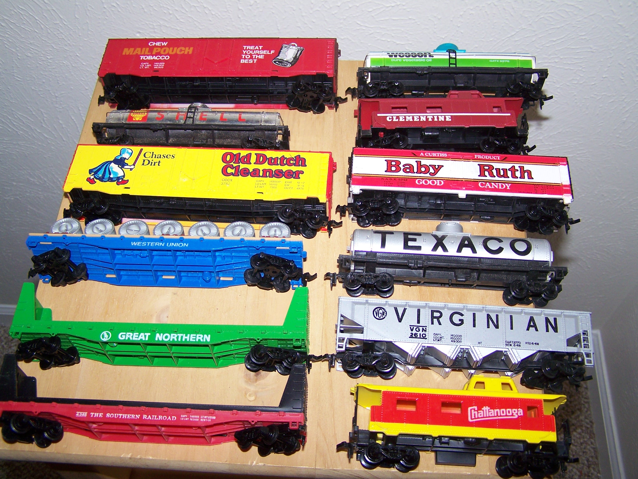 One piece in the lot that caught my eye is the blue Western Union Reel Car. It's a really a colorful flat car but I'm gonna say the "flash" from the camera has enhanced the color some... Looks like I will head towards Ebay to buy one!