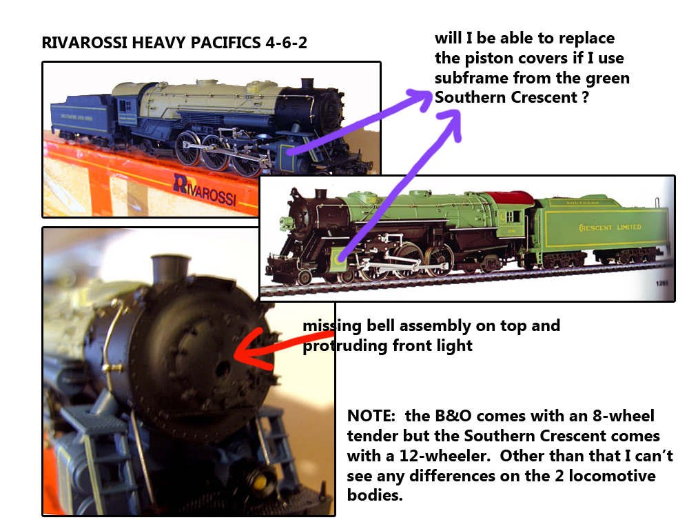thanks for your help. Actually the locomotive in question is a Rivarossi 4-6-2 B&O Heavy Pacific (President Washington) #1220/1976. I am expecting it to arrive from eBay in the coming days but I know it has a damaged smokebox front cover. The tender looks like an 8-wheel straight sided tender, definitely not a vanderbilt. I am hoping that the front smokebox cover from a 4-6-2 Southern Crescent Ltd model will be a good replacement as I will probably find a spare one in the coming days. Seeing that you are knowledgeable about the subject, do you think I could replace the subframe of the B&O with the one of the Southern Crescent ? Is there a way I could change the piston covers which are obviously a different colour/livery ? A lot of questions I know but I'd appreciate any help you can give me. best regards Edgar
