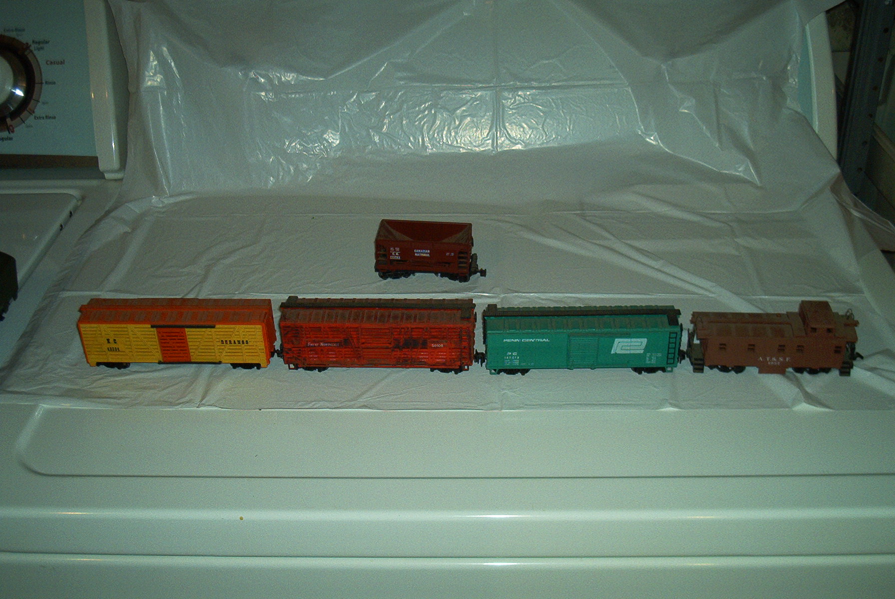 The Santa Fe caboose looks like an Athearn piece; the Penn Central car appears to be a Train-Miniature offering; the yellow and orange stock car is Tyco all the way, baby; and the red stock car looks like an AHM car.