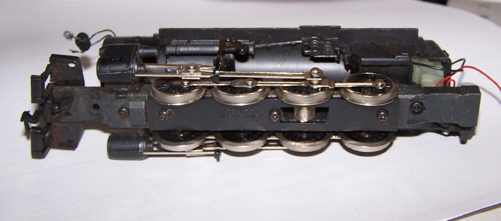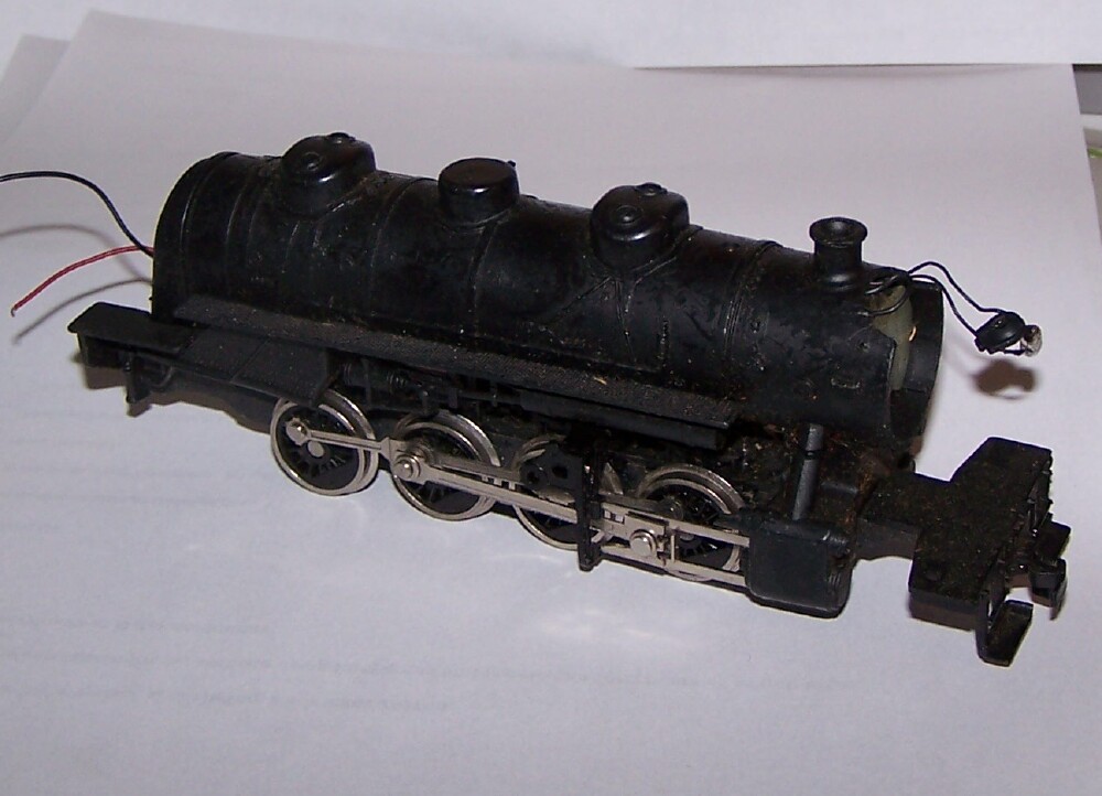 While going thru my "new collection" of junk box purchases, I found this Tyco unit, I believe it's the 2-8-0 Chattanooga Choo Choo steam engine with smoke unit. Except for the top rod piece on each side, the unit has all rods unbent and complete, the rods move smoothly when the wheels are turned. The plastic shell is broken up front, but the smoke unit appears intact. If anyone is interested in this for the parts, make an offer, and figure $5 for shipping in USA on top of your offer. I'll allow a few days for other people to come online and find it, not taking the first offer UNLESS its unrefusable. LOL. Whatever that is. Anyway, here's a couple pics of it.