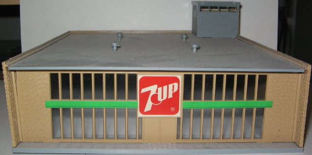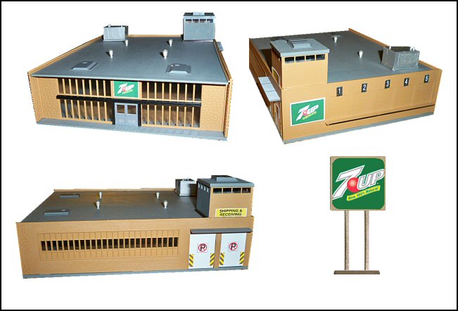About 10 years ago, there was a *Pepsi* bottling plant near my home that had a front that looked like the kit, but it was a single story building. No front door, because it faced the highway - but for years you could see the bottling machinery working through the windows. Especially at night, driving past everything was lit up in the plant. Then Pepsico obscured the windows so you couldn't see in anymore. 2 Loading docks on the one side like the kit (which was fenced off because the trucks were parked on that side against the building). The back wall was solid (it was against a street - no rails to it). And the other side was solid brick with a single entrance door- where employee parking was. Aside from the front, there were no windows that I remember or any sign the building ever had windows that may have later been bricked up (it really wasn't the best part of town ...). There was no tower, just a lot of Air Conditioning units and vents. It was a smaller Pepsico facility and ultimately, they closed and moved to a higher capacity plant somewhere else in the state. Stood vacant for about 5 years, then some company moved in and modernized the building's exterior so it's not the same anymore. But every time I see the 7UP kit, it reminds me of the Pepsi plant.