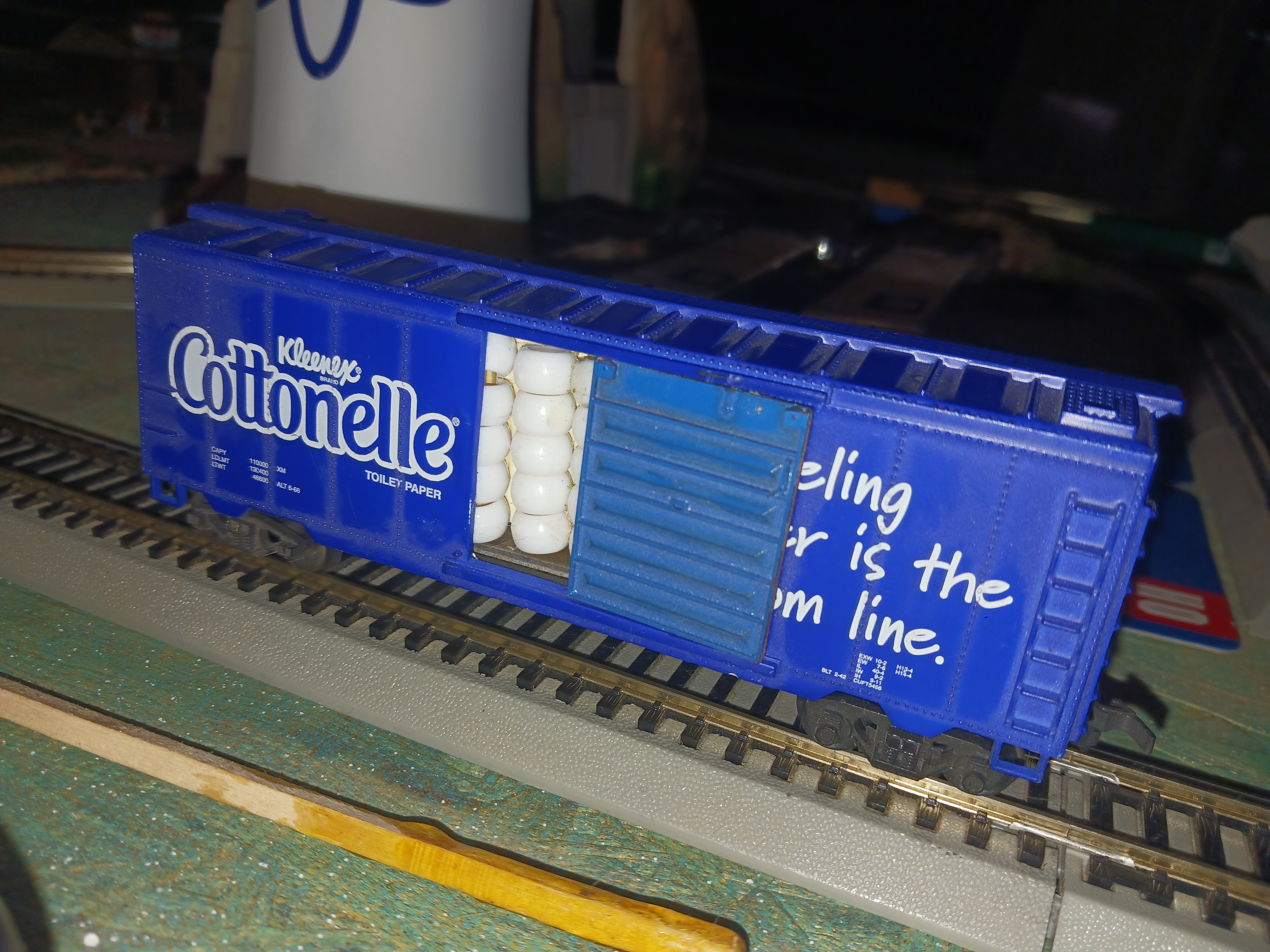 Getting my old computer to stubbornly cough up new images. Armodilloville has been set up in its new dedicated train room. This lovely piece was from my sister, May, and into was added a fresh load of TP.