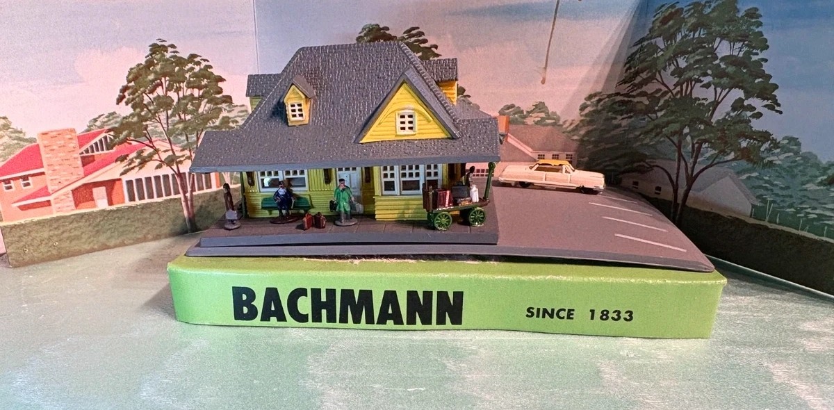 The passenger station is made by Atlas in HO, the walls would need to be repainted yellow to match, the HO kit comes with dark red walls, other than that the colors match. The switch tower, freight station, and farmhouse were made by Revell in HO, the freight station was later released by Tyco as well. The switch tower by Revell was yellow, not dark red, and the freight station has multiple parts that would need to be repainted to match Bachmann's N scale one. The Farmhouse matches between the 2 scales in terms of colors, but it looks like Bachmann made the porch wrap around 3 sides of the house instead of 2 like Revell.
