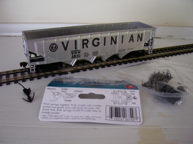 Here's a pic of the couplers. I put one in the VGN hopper in less than a minute. I ran it with a loco with the old style brass box spring KD coupler and it pulled well. Once I removed it from the track I noticed the whisker on one side was hung-up on the Tyco coupler box. I tried to trim it and couldn't cut it with my pocket knife but when installed again it sprung ok to both sides of the coupler box.