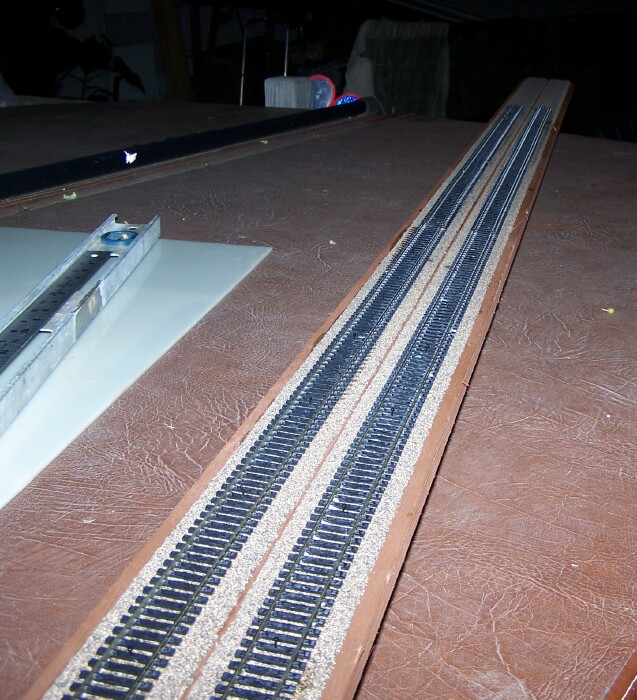 Got a little moto-vation going tonight after getting home from work to accomplish something, so I decided to get the 8 foot long T-module out of the basement and lay some Code 100 on it. Got my hand tools, measuring tools and glue laid out on the hot tub, propped up the module, and got to work. after a couple hours work, and some interruption by a pair of raccoons foraging in my backyard, I got 4 pieces of 3' flexi-track laid on the cork roadbed and glued down on 2 inch center. It's not laser straight, but using a 2 foot level, I got it reasonably close to acceptable for me. here's a pic of it after I took a short AC break inside about 9:40 pm.