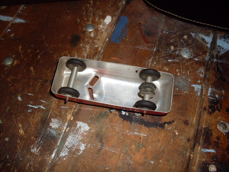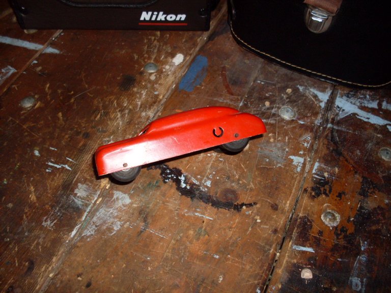 i have studied this car since i noticed the posting,the 2 extra wheels on rear axle look smaller than rest,and look like guides for something,would have said the holes on side had some play in this but are partially blocked by rubber tyres, aluminium seems to be what its made with,got to have been made by a toy company as its a pressing/mould made model,to good for a one off,so who,i like jerry think us toy firm just at end of war,48 to mid 50s is my guess,any ideas what car its supposed to be,might be way forward,ken 50/1 mercury tootsie toy/midgetoy