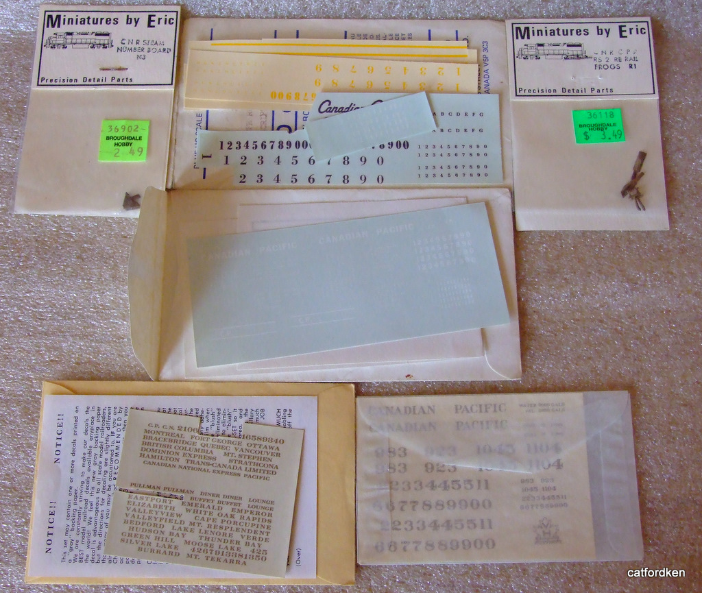 top left cnr steam number board,top centre lpd decals cpr road switchers script lettering,top right minatures by eric cpr rs2 re rail frogs ,centre middle lpd decals cpr tanker decals,centre bottom left champ cpr passenger car decals,centre bottom right van hobbies cpr loco tender decals