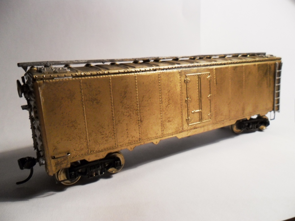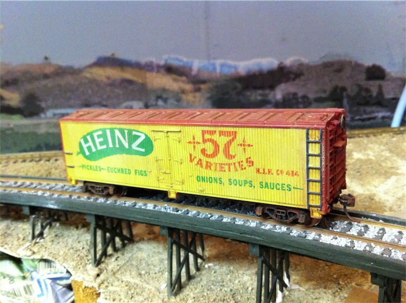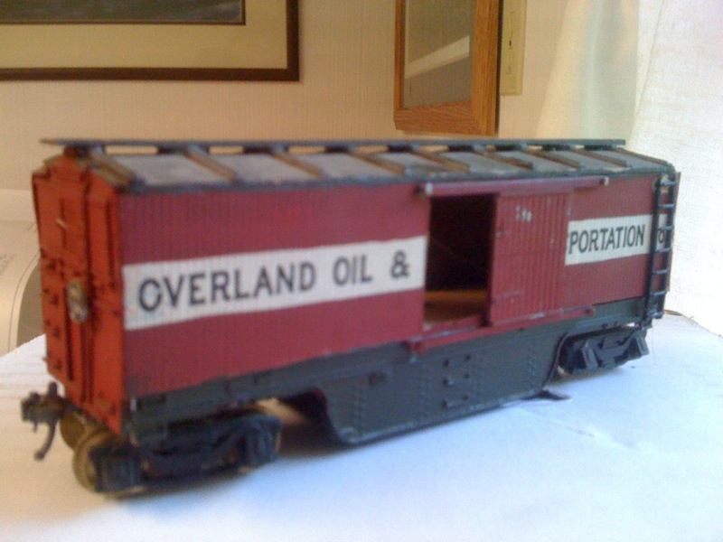 My car this week is an early kit produced by Redball. Overland Oil & Transportation Co. The Overland Oil car is a combination tank car/boxcar. The kit is Red Ball. It was made and sold by M. Dale Newton,then during the 1955-75 era by Howell Day and later as historic reruns by Wabash Valley/MRRW. The cast "fishbelly" is an underfloor tank for oil transport that predated "regular tank cars" in Pennsylvanisa based oil service. The boxcar was for use in back hauls and to insure the car would not become obsolete if oil was just a passing fad. Sorry, photo was taken using my cell phone:
