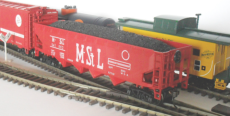 Minneapolis and St. Louis Railway quad hopper by Roco, much more like Tyco than my fancy metal ballast hoppers. Though it's a duller red in real life and most of the weight is in the coal load, I like it just the same.