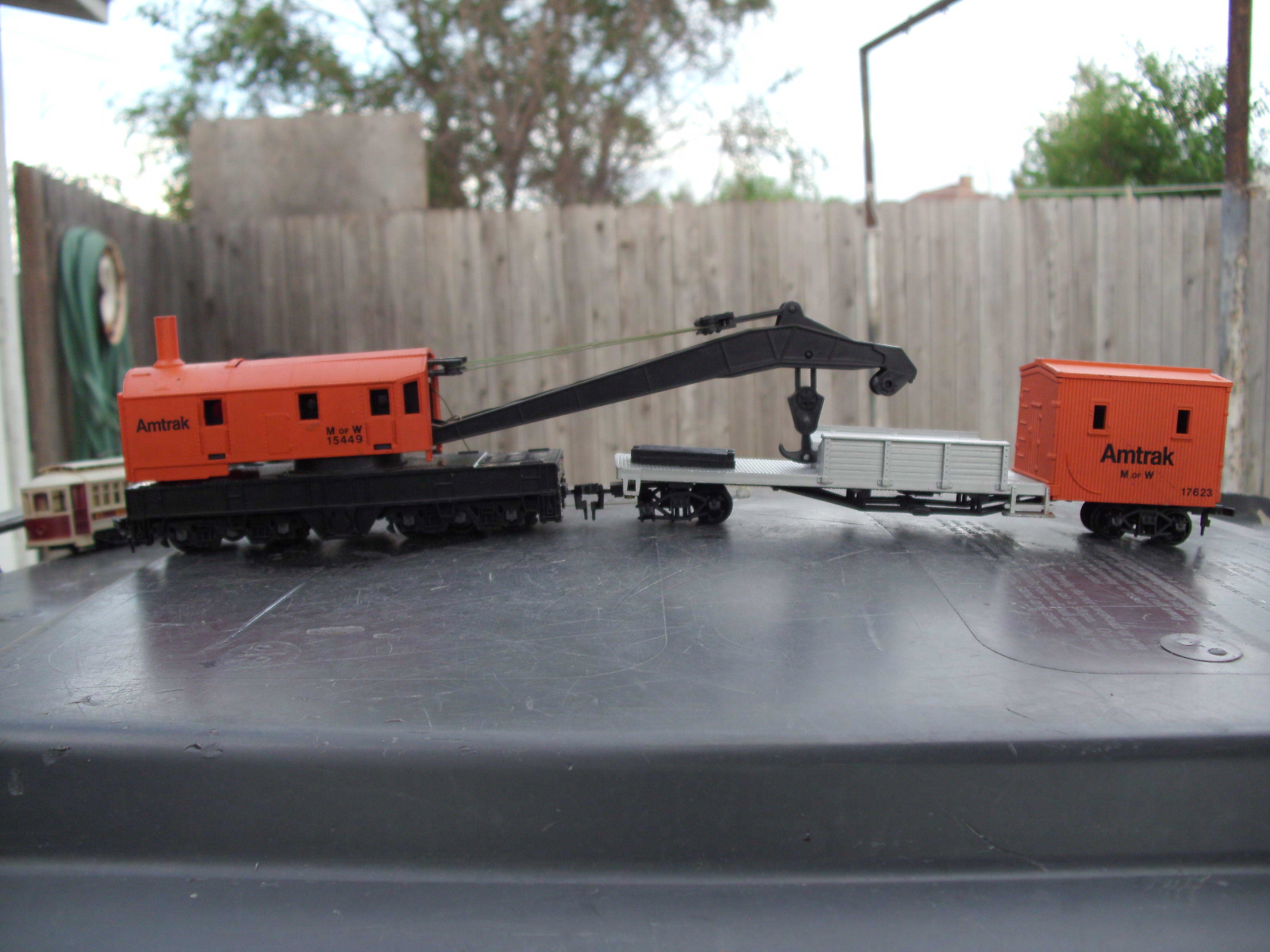 Orange Amtrak MOW crane & flatcar/caboose(?) by Bachmann