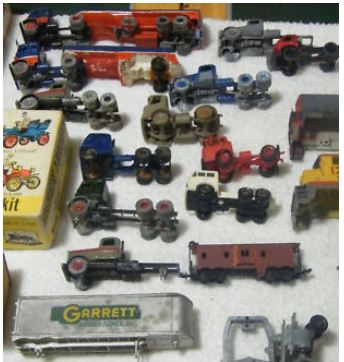 On Friday Aug 5th 2011 - Severe rains ( over 4 inches+ in less than an hr ) hit here in NC causing massive flash floods. MY dads garage was flooded some due to water pushing under doors. My trains are stored there now. I didn't loose any trains but lost a lot of magazines and other rr paper material i had in boxes on the floor. I spent over 4 hrs washing mud and silt offr of garage floor and then putting my remaining train items into plastic storage tubs that were in boxes off the floor. I found a large stash of my ho vehicles - going to post pictures - This is first box i came across. It may take me while to post all as there are more i don't have here with me right now