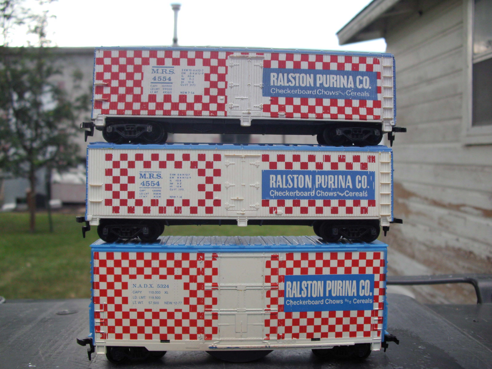 Something about the red Purina box cars that I like. Won this one while being away from home bidding in a motel... I also bought the one pictured above sometime back. I have two and that's enough. http://www.ebay.com/itm/271121016953?ssPageName=STRK:MEWAX:IT&_trksid=p3984.m1423.l2649