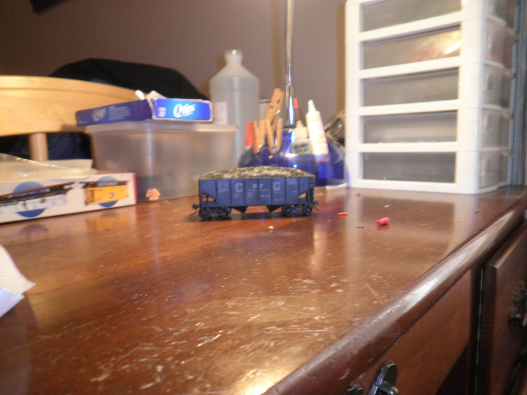 My Varney Central of Georgia hopper. Sprung metal trucks, Kadee #5's and a coal load!Not bad for $7.