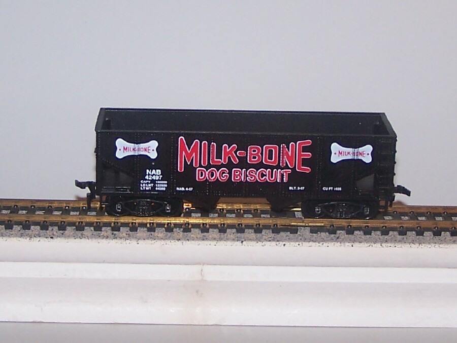 I think I have a bone to pick this week, and it's appropriate to dump it into this open hopper by Model Power. one of the few non-Purina cars I have related to pets. If anyone knows of any other pet-related train cars, I'd like to know about them. I have most of the Purina open and closed hoppers, boxcars, etc. Are there any Horse, Parrot, or other pet-related cars out there? Anyway, here's the hopper to fill with choppers.