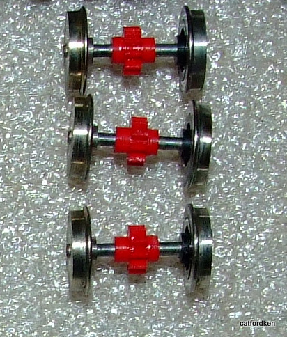 The wipers pick up from the insulated wheels with the plastic centers. The all metal ones conduct power to the frame through the axles.
