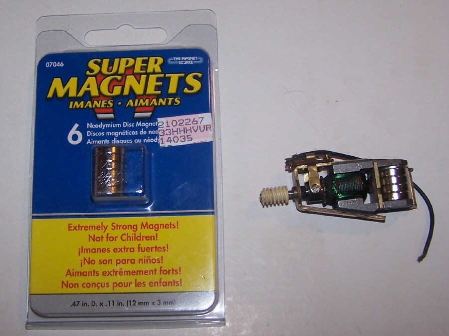 Now, as far as the disc magnets, Servi-star Hardware stores sell them, I got them locally, and found them at the HW store near my work today, too ( But they were 10.00 for 6 of the little ones, Servistar P/N 2102267 , original P/N 07046, called Super Magnets, in a blue and yellow blister pack about 4 x 3 inches , magnet dimensions .47 inch diameter, .11 inch thick. Other details - Master Magnetics, Inc. at WWW.magnetsource.com , Castlerock, CO , Made in CHina, yada, yada, yada.