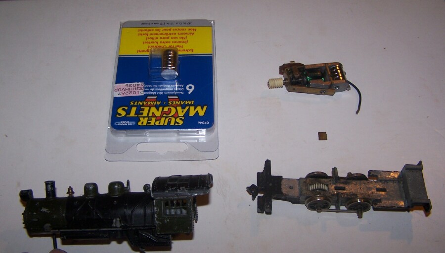 Well, Sunday night, I took apart my Mantua Shifter loco ( I posted it in LOTW Sept 17th ), and finally got the armature to move after cleaning the brush and contact pads up some. STill, the engine didn't move fast, or far. So, I had the bright idea of using some super-magnets I had bought to see if the motor would speed up any with a stronger field. I wonder which way they should go on the motor? Well, long story short, I de-magnetized the metal chunk in the motor. . Then the wires started smoking a bit from too much amperage when I tried to run it. Ok, NOW what do I do? Well, I DO have these super magnets....