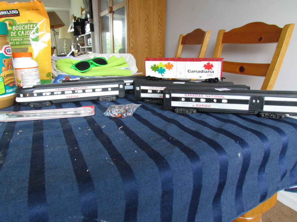 Here's a pic of all the stuff. 6 CN streamliners (only five in the picture), a Canadiana boxcar, a bag of 100 HO people, and a saw blade: