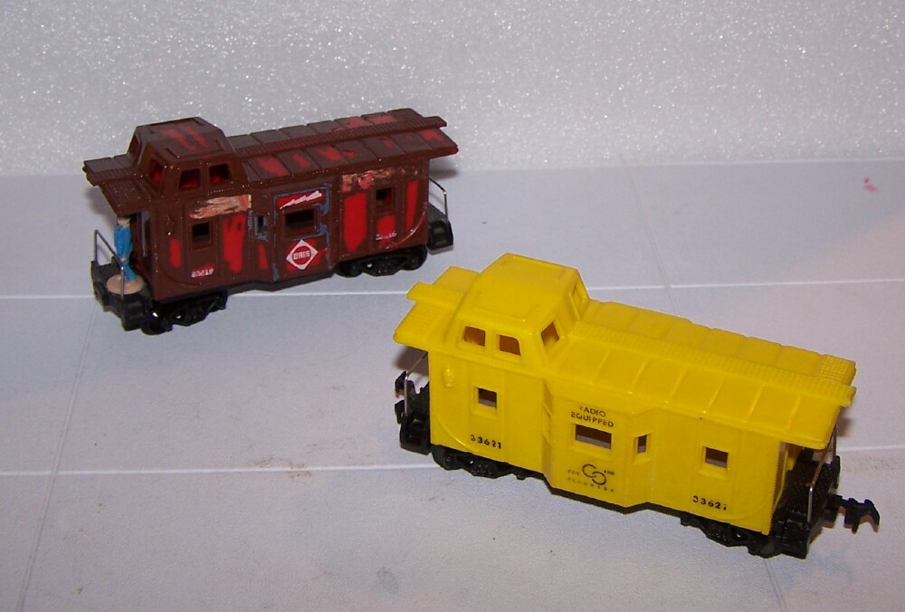 Here's a little rare treat - a yellow Marx ( or AC Gilbert ) "Bayola" C&O caboose, as I call them. Has the Marx trucks, but was listed at auction as an AC Gilbert. No markings on the bottom. The brown/red one in the background is the one I originally got a few years ago. This yellow one is in very nice shape compared to it's sad-sack brother back there.