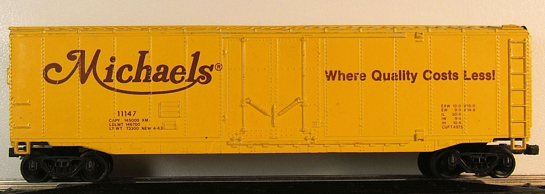 I bought this car on Ebay because I like promotional/advertising boxcars. Now, the question is "Who is it for?" It's a Bachmann car and it's marked as a registered trademark. My first guess was Michaels Craft Stores, but it's not their logo. I tried googling "Michaels Where Quality Costs Less" and came up with nothing. Anybody know what this Michaels is?