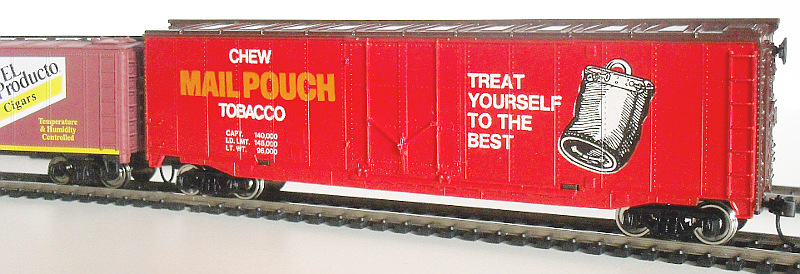This historical oddity is a Tyco 50' billboard boxcar spruiking Mail Pouch Tobacco. Blergh! Don't get me wrong, it's a handsome enough freight car that oughta come with a Surgeon General's warning. To be kind, a toy of its time is all.