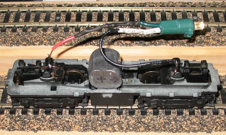 Here's a shot of the current project I have on the bench. I wound .010 solid wire around the metal axles on opposite truck sides as wipers, then twisted an extension from each arc of wire where I soldered the LED wires. If the wiring looks backwards, it is- I mistakenly wired the LED backwards wit hthe positive lead connected to the black wire, so I had to wire it in backwards, so that the LED would work only when the unit was backing towards a freight car.