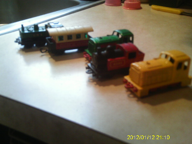 I have a yellow shunter, the green one like in the center, and one trolley/passenger car? Don't have the red and black engine, or that other green one on the far left. What is that? I'm going to try to power the yellow dock shunter with some kind of HO drive system. Has an LED on the roof , and an aluminum exhaust stack modification to it.