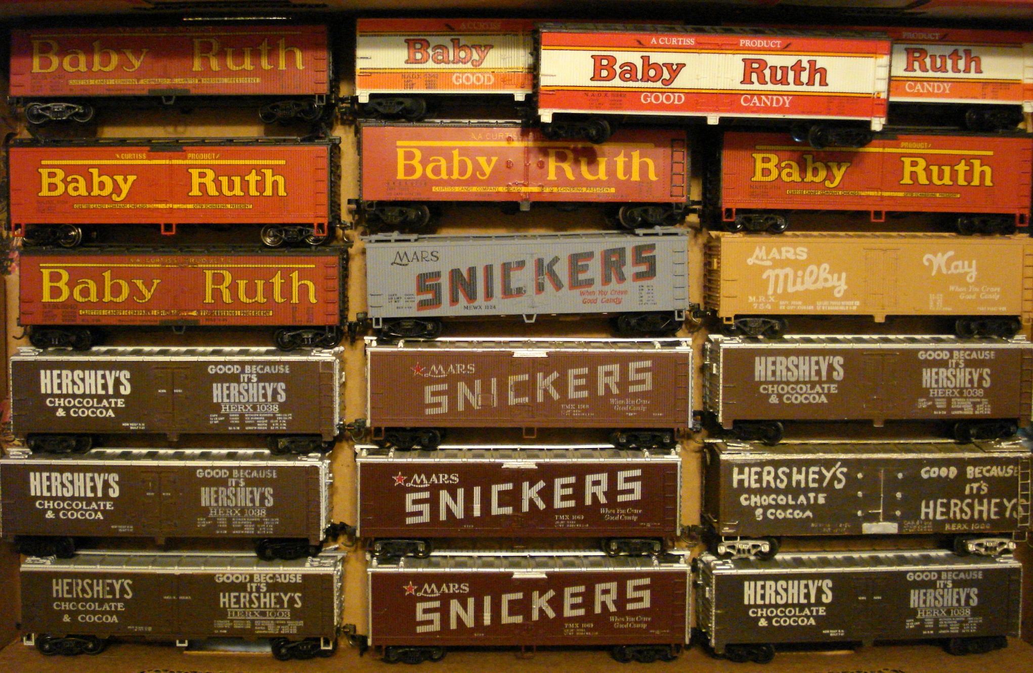 The Baby Ruth cars include TYCO... metal MANTUA (red, below the mid-column TYCO), Train Miniature, Athearn...