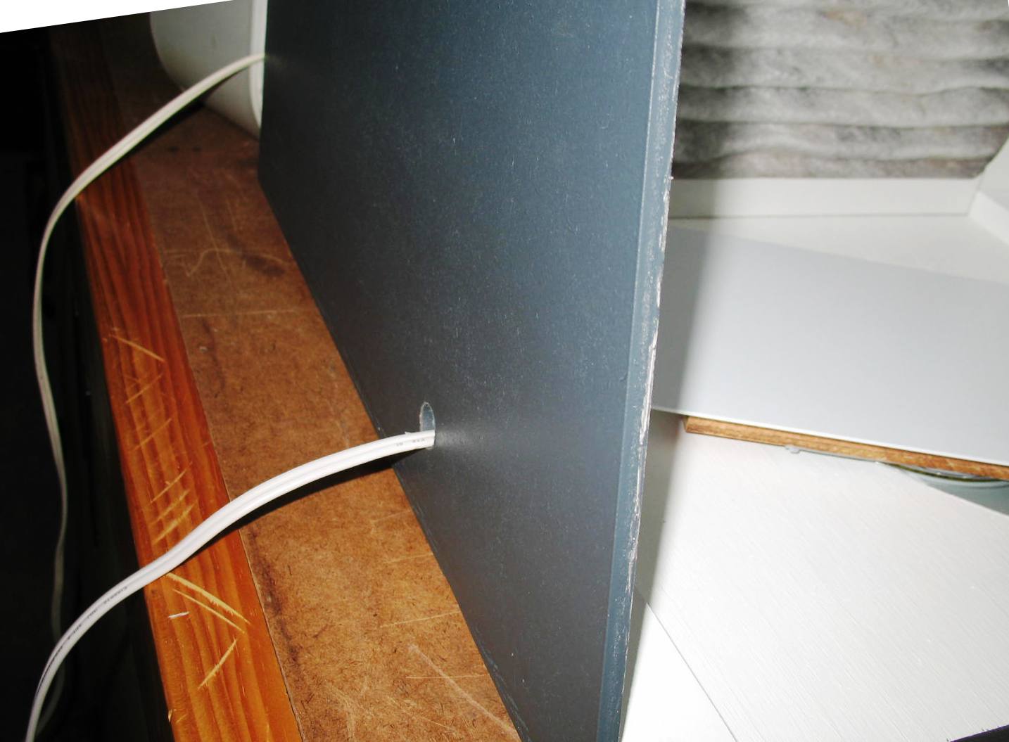 I also found that some of these spray booth articles mentioned th benefit of a light for the interior of the booth cavity, as well as a 2-3 inch polenum (space) between the filter and the fan itself. As you can see, I set a 14 x 20 filter into a frame at the rear of the booth, with a plenum after that. The filter is easily and cheaply replaced after about 20 uses (I reverse the filter halfway thru the cycle top to bottom to top, as most of the spray hits the lower portion). and recently have begun using a filter cut to fit from a synthetic material sheet (make your own filter) found at WalMart.