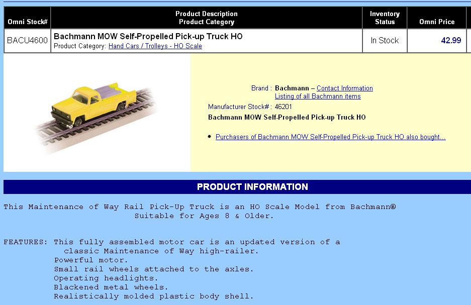 HOLLY COW!!!! 42$$$....Im better off looking for a used one on eBay...LOL...They have gone CRAZY on their prices anymore...I bought the bachmann gandy dancer in 1988 for 5$ and just the other day I saw it in a local hobby shop NIB for 32$ The Conrail truck was made for several years. I see them from time to time but until now I'd like to add one to my collection just for giggles. They run like crap and jump allover the place buy they are still really cool. Look up in this thread and I have a picture posted of the conrail truck.