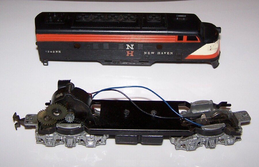 While cleaning out my closet to reorganize it, I found some boxes of HO and Lionel train pieces I'd totally forgotten about. Anyway, this one came with a New Haven shell, but there's no attaching tabs on the chassis for it, so I assume it's the wrong shell. Interesting motor and chassis, never seen one like this. The truck sides are actually cast metal, not plastic, and the trucks swivel between fingers extending from the chassis. Another feature I haven't seen before. Wheels are extremely dirty, yet it runs almost silent, and very smooth for this style of motor. No ID on the bottom at all, has 4 large ribs in the metal tank. Any help appreciated here.