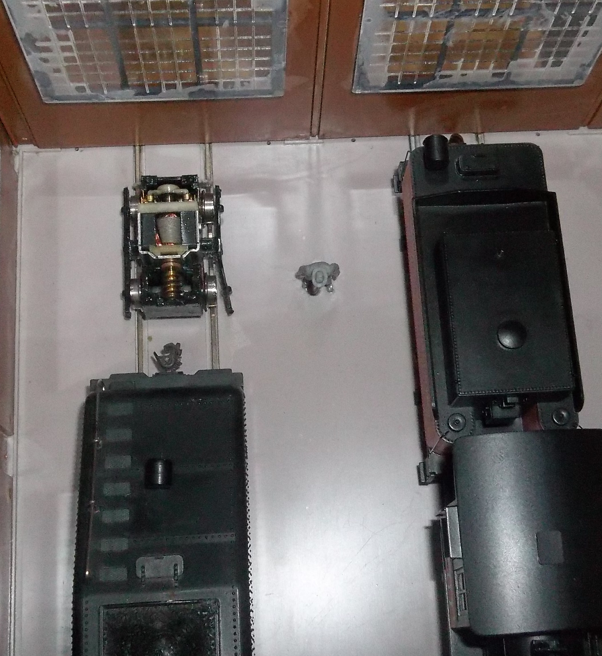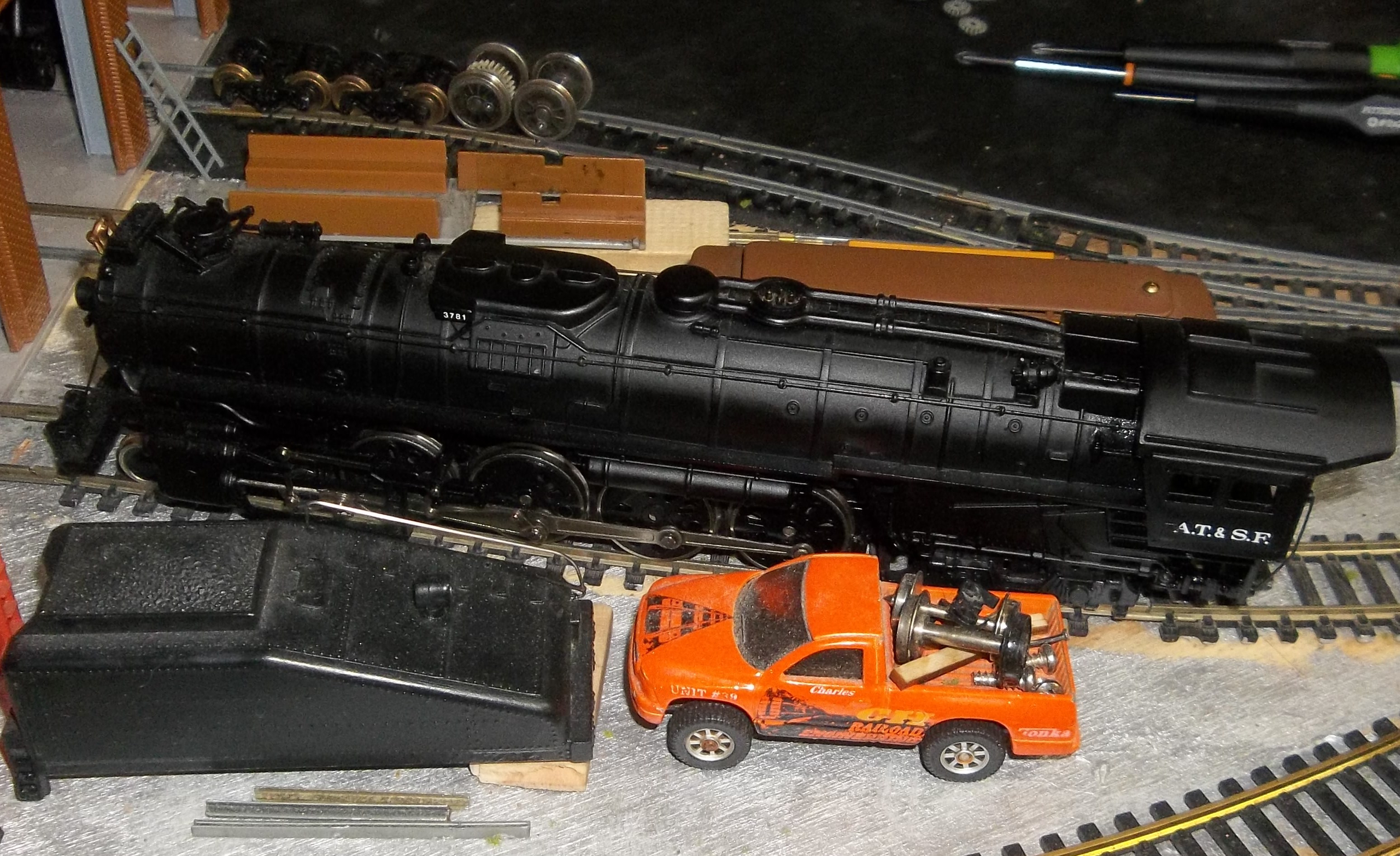 here's my bachmann cable cars power truck in my shop for work, even with detailed lubrication and run time it still doesnt run well at slow speeds, i intend to fix that, but i've got other stuff to work on.