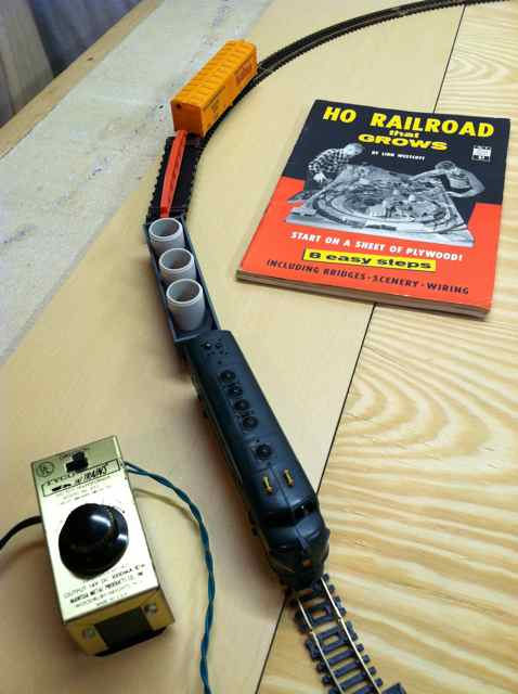 Per Mytyco's suggestion, I'm test-posting a couple shots of my cabooseless* T6412A Pacemaker East on the oval. Also my dream book from the era, "An HO Railroad that Grows". I spent hours pouring over it as a kid. Nostalgia heaven.