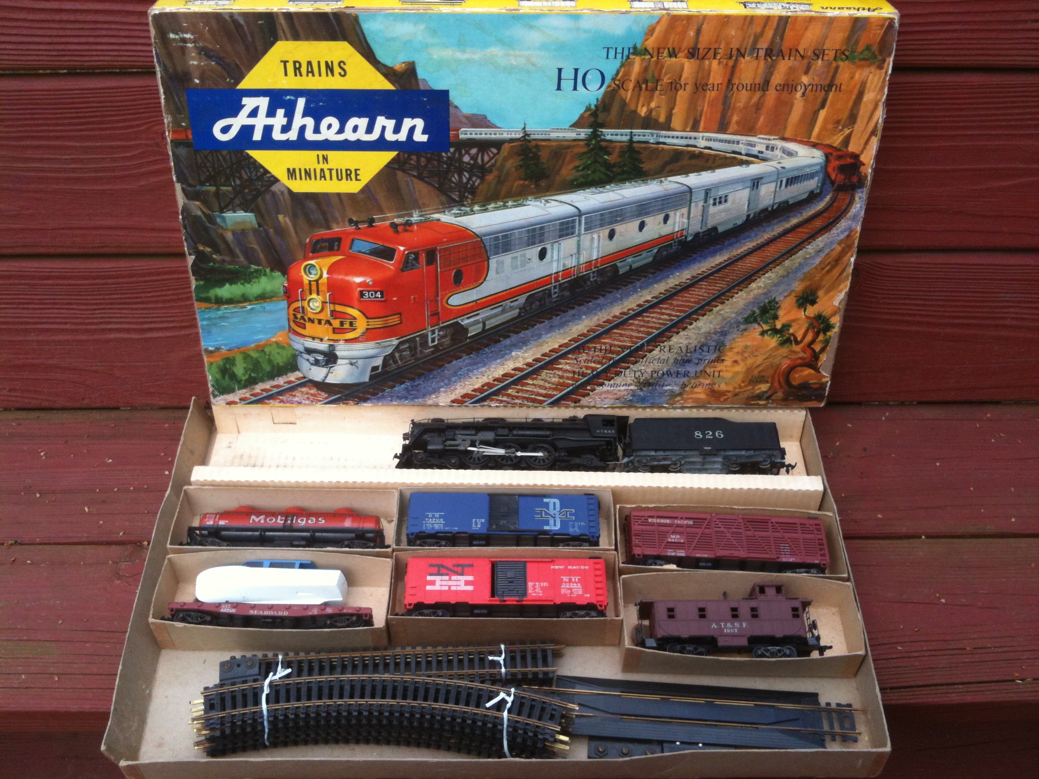 Picked this up today - a very rare Pacific set (stock #4080 - not listed in any Athearn books). Santa Fe 4-6-2 with gear drive (pickup in tender) and 6 cars. What adds to the rarity is that the pacific has incomplete window panes on the firemans side - I looked at them closely and there isnt any sign of breakage - just that they werent all fully connected. The 2 40' boxcars represent the earliest version and later versions regarding the door jams (early cars have seperate door jams and the doors slide in them top and bottom. Later cars have molded on ones and the doors have latches on the bottom that slide along the bottom jam). The B&M boxcar is also an error piece - it wears the wrong roadnumber - its the same number used on the black "checkerboard" scheme car sold at the same time. All in all a great set purchased for less than the value of just the engine... Larry