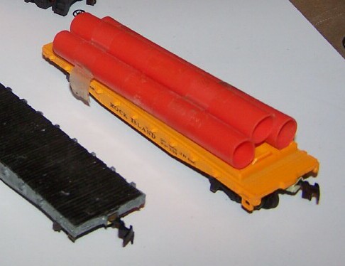 Something different in the pipeline, I found this old Mantua flat car with pipe load at an antique show in January, first time I'd seen a Rock Island flat, and yellow to boot? Since I have some RI stuff, Bl-2's included, this had to come home with me.