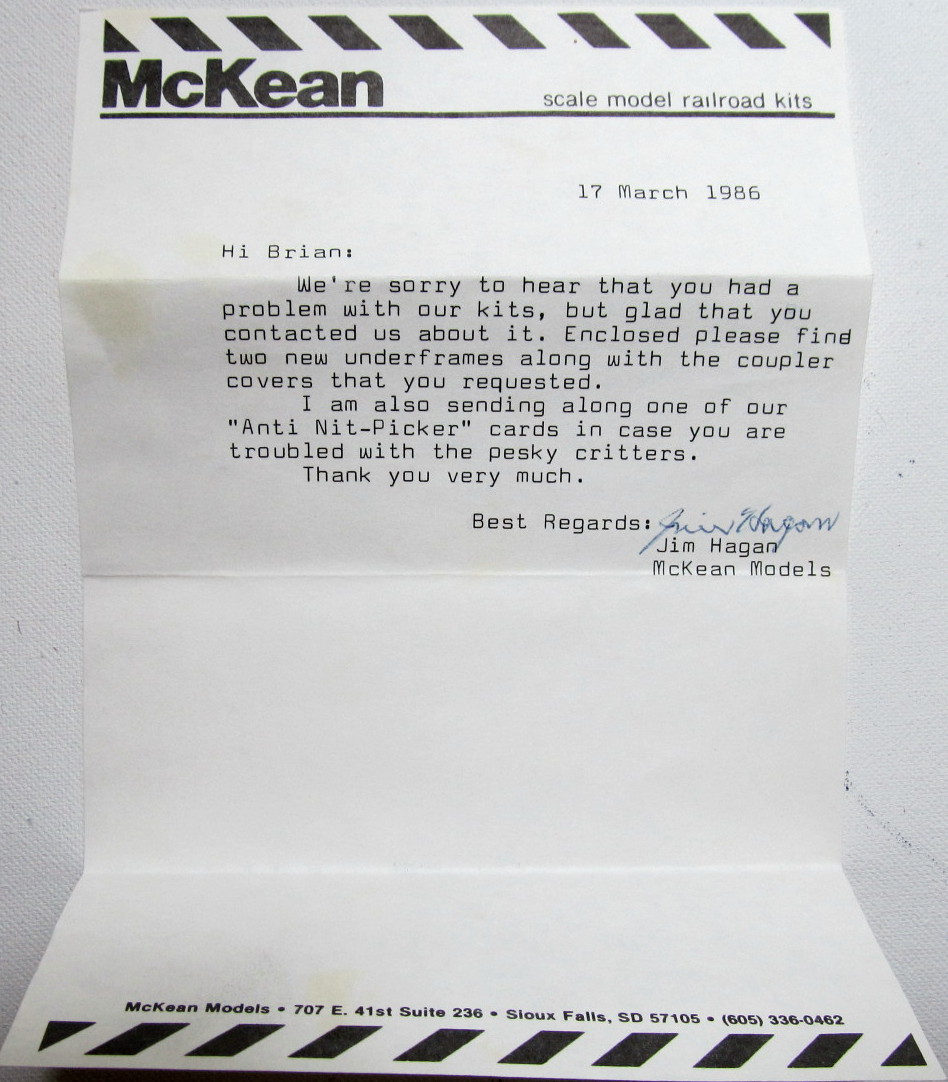 Back in 1986 - I had purchased 2 Greenville 100 ton coal hoppers from McKean - Got home and found missing parts and damage to under frames. Remember - In this period of time - there was no world wide web - but there were pens n paper. So i sat down and wrote them a letter and mailed it to them explaining my problem. They took care of it and me and here is the proof . The response i received back from them on the letter below - Companies like this who take care of their customers always trump over the ones who don't. Kudos to McKean Models - I was 14 in 1986 - Note = The letter was done on an Electric type writer