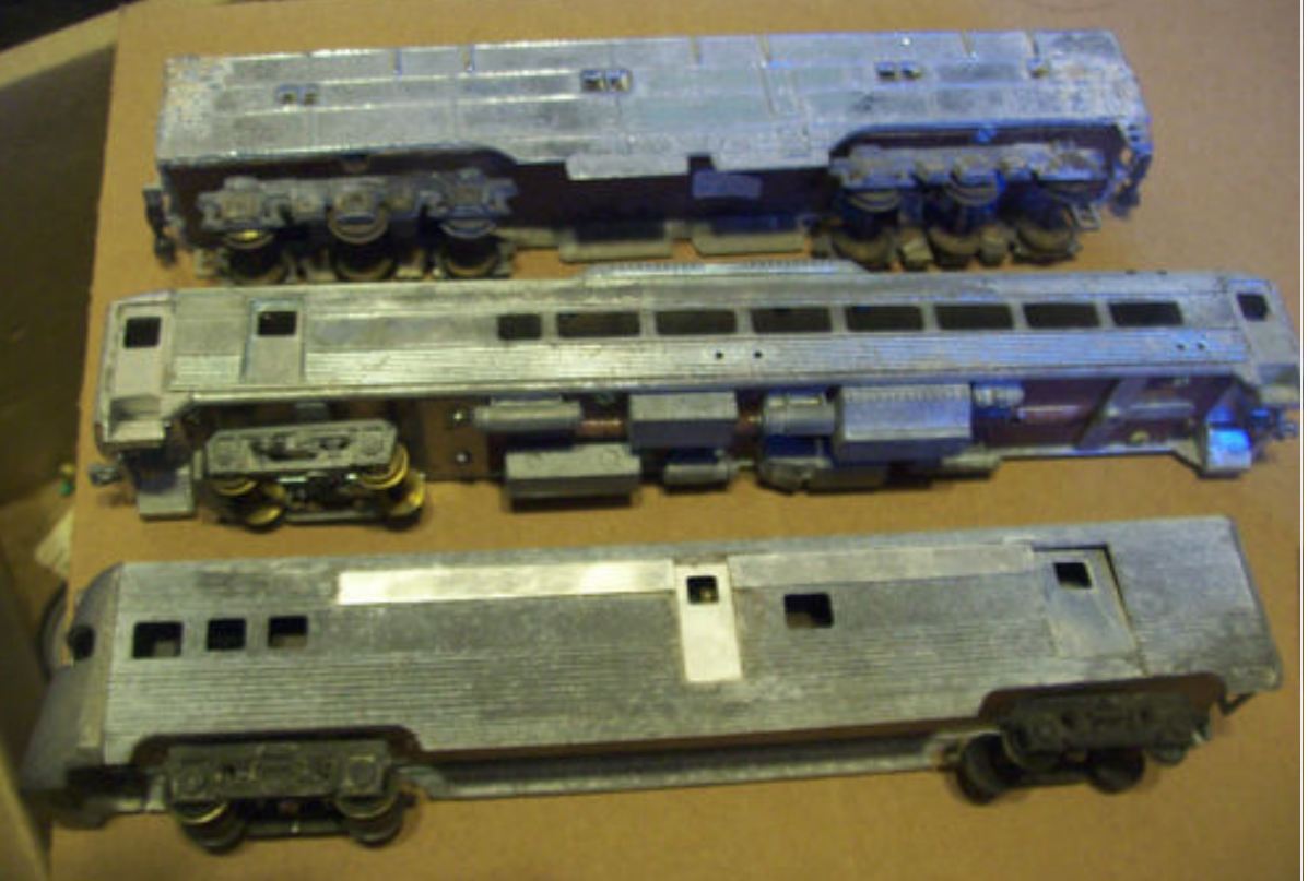 The top unit is a chrome plated E7-E9 dummy B unit. It appears to pre-date Hobbytown and has a resin fibre board chassis. I am giving it to a friend who has a very thorough library of early and vintage HO. He is going to try to figure out who made it. He is the one who told me about the Sampson originally. He has the 1949 version.