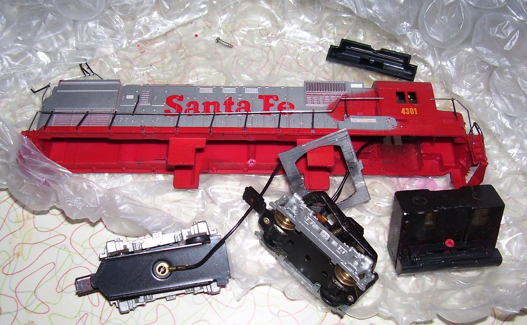 I got this really cheap from a dealer with one sale and they shipped it, and another engine that was trashed worse in a different package, in bubble wrap and brown paper. When I opened this package it looked like this. I figured for the price the handrails were worth it and theyr're complete. The tank lugs were snapped, no couplers and the coupler tongue bent, the rear plow broken and the bolts that hold the aluminum plate on the motor bogey broken.. I put the works in a Silver Streak shell and finally go it to run. The other engine was a LL GP35 and the rear pilot and steps were gone but not gone in the auction pic. I got that for free but it's junk.