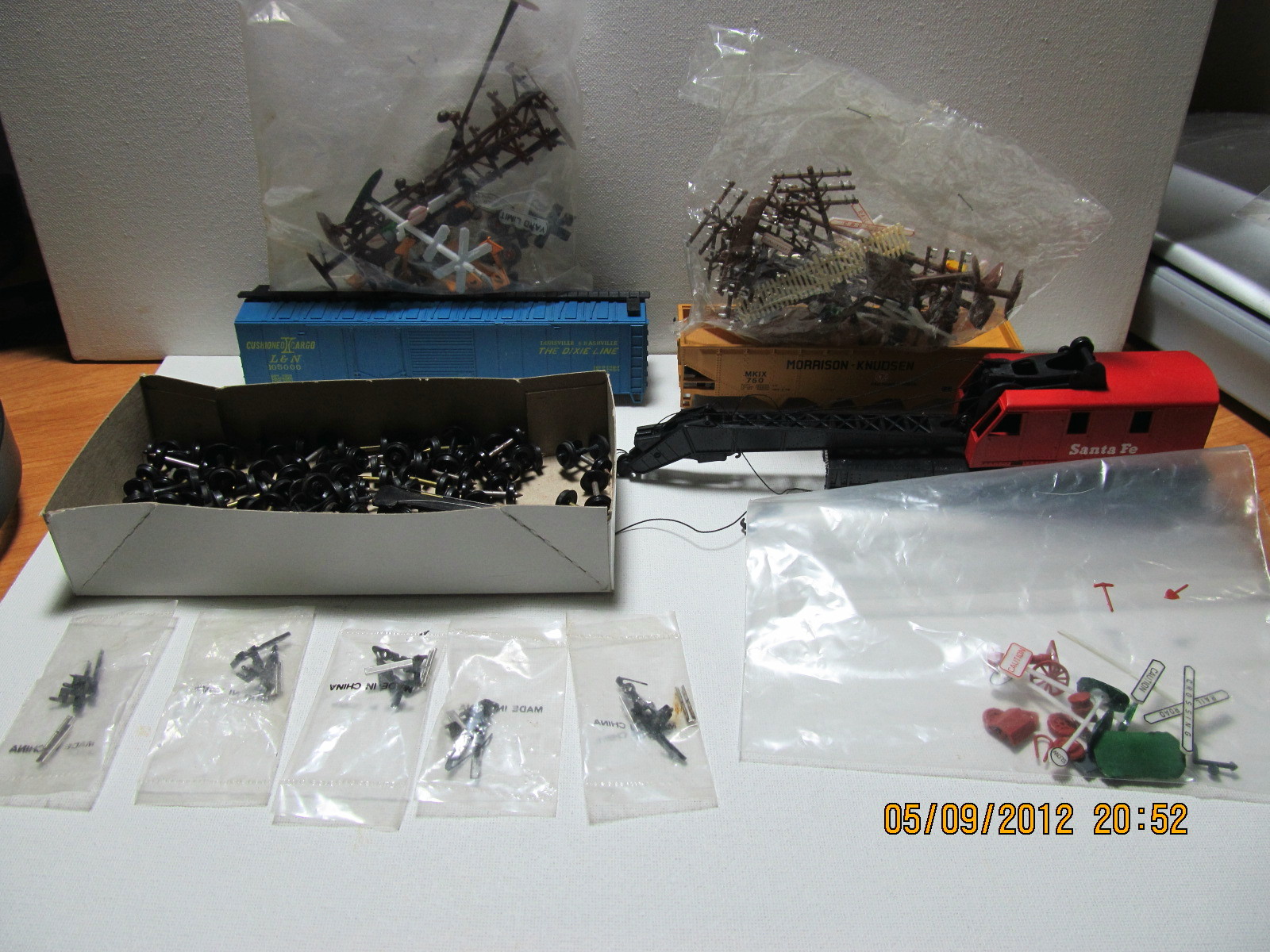 You get all this - One Deal - no parting - Flat price including shipping for US = $10.00 - You get a L&N box car - 2 steps broken off -needs trucks - Bachmann Morris Knudsen coal hopper - needs trucks - all steps intact - TYco SF maintenance crane - missing one set of trucks - stringing needs work - 2 sealed bags of telephone poles signs - another bag with signs and small ho accessories - X2F Horn Hook uncoupling jig - 1 box of 33 assorted Tyco and other wheels - wheels only - no trucks - First to reply gets - PAYMENT - DUE with in 3 days or sold to second person wanting and so on. Price above includes shipping to you
