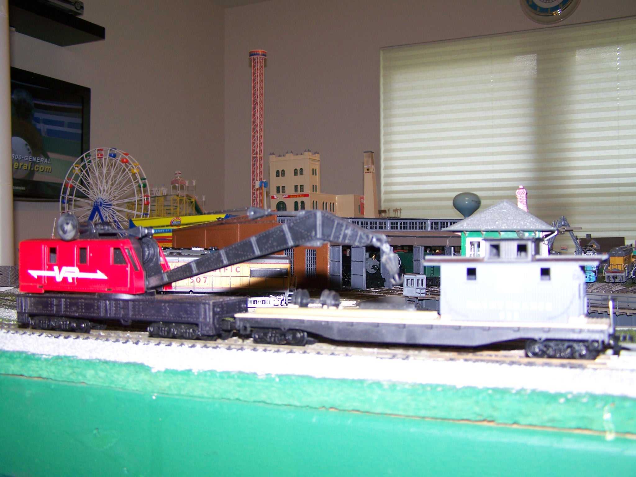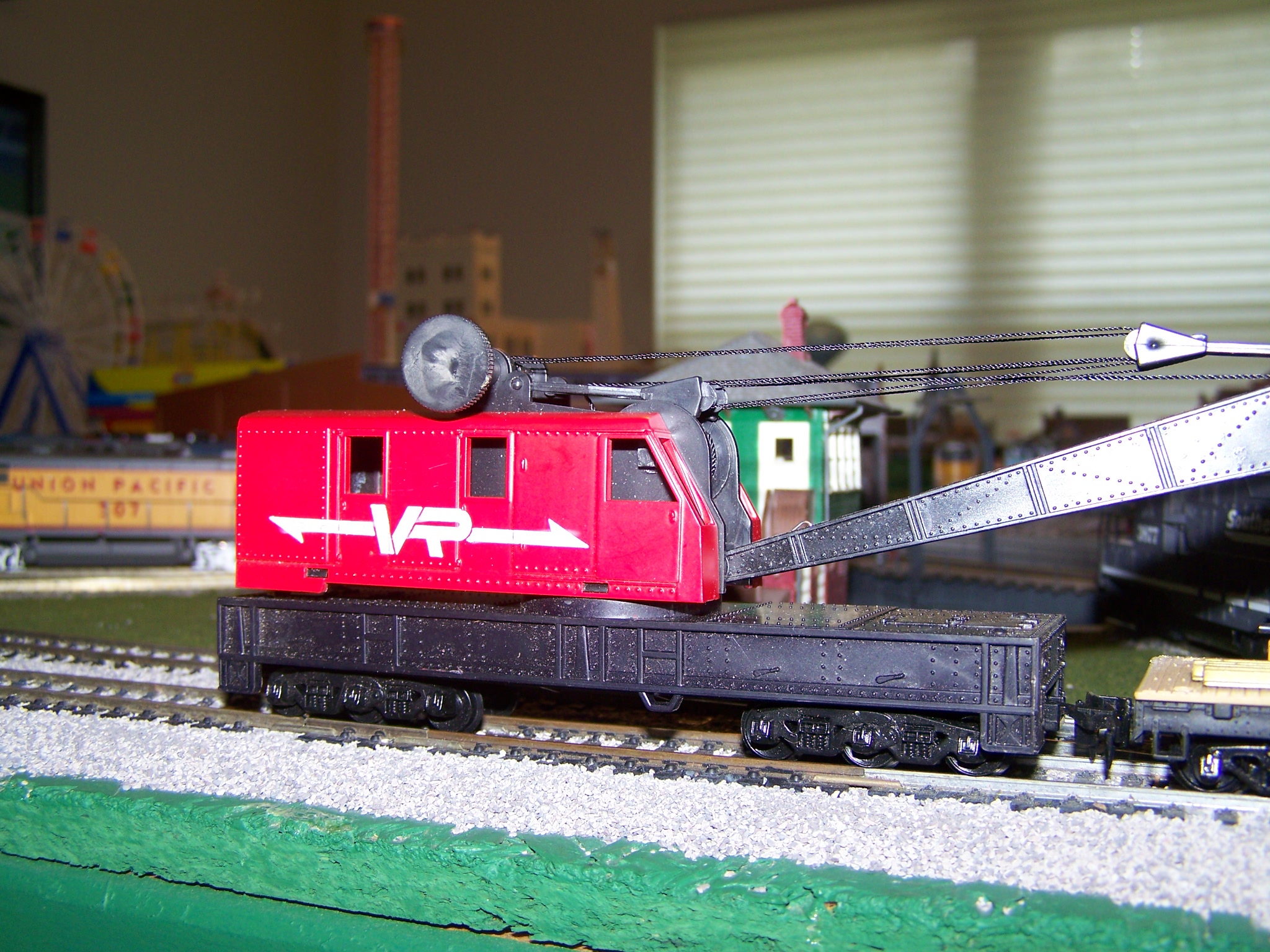 I found this Tyco Aussie VR crane car, interesting the boom tender has Santa Fe on it. Hard to see it in the pic with the camera flash.